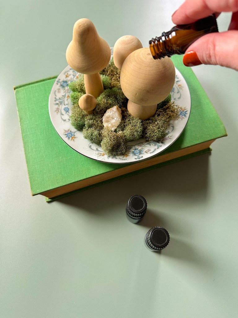First, find a sweet little saucer or dessert plate at your local thrift shop—I have collected many as they are endlessly useful. You’ll also need a hot glue gun, dried moss, wooden craft mushrooms (or get more creative than me and make your own from natural clay), and crystals to adorn if you’d like. Decide how you’d like to lay out the arrangement, and glue on the mushrooms first, pressing as the glue cools to adhere it well. Then add glue to the plate and tuck moss around to give it a springtime forest floor look. Finally, tuck any crystals where you’d like them. You can always get creative and put your own spin on it, adding items like dried flowers, acorns, etc!