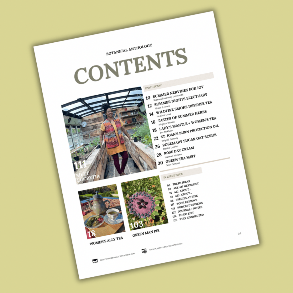 A plant lover’s dream, Botanical Anthology is a seasonal, plant-centered digital + print magazine bringing you over 40 articles from over 40 contributors in 110+ pages to incorporate herbs in your apothecary, kitchen, self-care, foraging, gardening, crafts, and summer celebrations. This is our ninth edition, beginning our next circle around the sun.