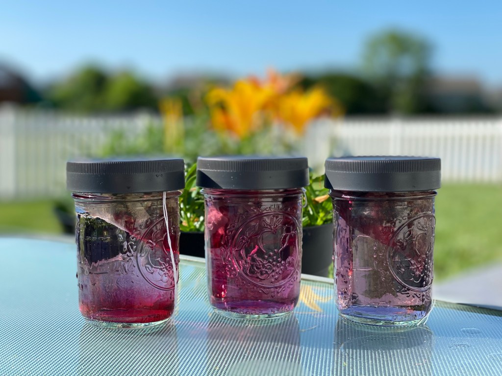 You can’t beat the power of the sun to brew tea. It’s so simple, and you feel like you’re sipping on summer sunshine when you drink your brews! Just add about a tablespoon of herbs per cup of water in a tea strainer or eco-friendly paper teabag, place in a glass jar, fill with cold water and put the lid on tightly, and leave in full sun for 2-4 hours. I sometimes stir in a bit of sweetener (honey works great or your own choice of sweetener), place in the fridge for several hours, and then sip straight from the jar with a reusable straw.