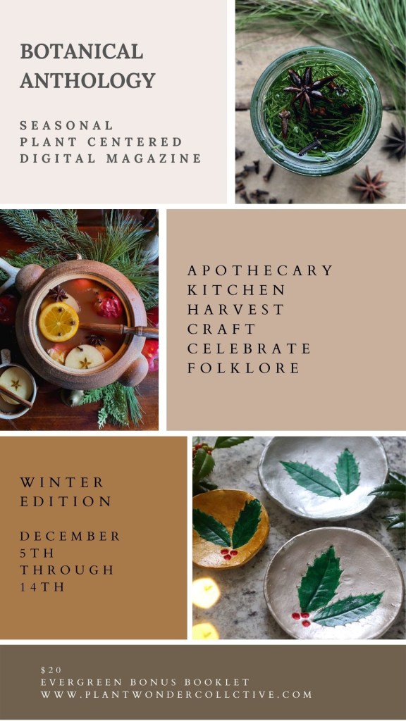 The Botanical Anthology is a seasonal digital magazine for plant and nature lovers with articles to help you incorporate herbs into your home apothecary, kitchen, foraging, crafts, and wintertime celebrations. It was founded by the Plant Wonder Collective, a group of like-minded plant lovers from a variety of backgrounds and walks of life who each have unique perspectives and approaches to share. Nurture your mind, body, and spirit through the winter season with the words and ideas from our hearts to yours!